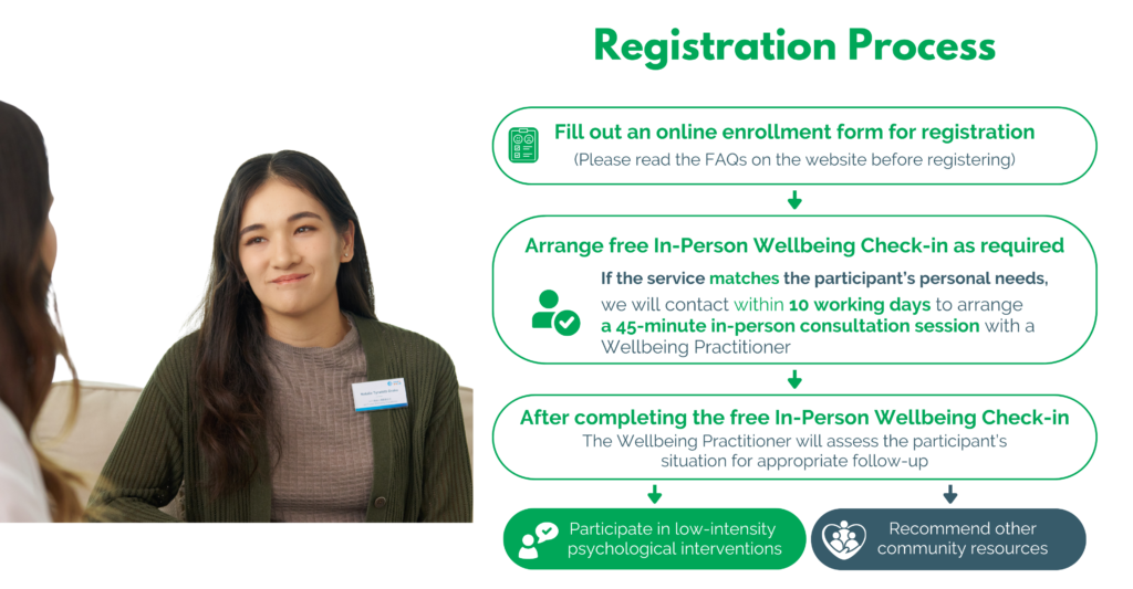 The service, conducted by trained Wellbeing Practitioners, will offer 1-on-1, in-person consultations to help participants better understand their mental health conditions and needs. Each session will last approximately 45 minutes. After the assessment, the Wellbeing Practitioners will evaluate their situations and recommend low-intensity psychological intervention when appropriate, enabling them to take an important step toward improving their mental wellbeing.